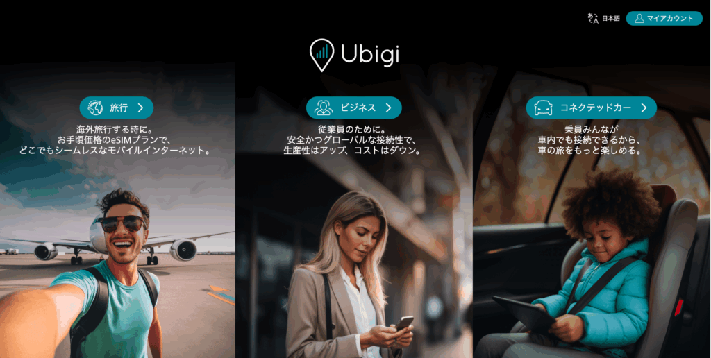 Ubigi(ユービジ)は、Transatel(NTTグループ傘下)が提供するグローバルeSIMサービスで、200以上の地域をカバーするデータ専用プランを展開しています。スマートフォン・タブレット・ノートPCに加え、コネクテッドカー向けのプランも用意されており、旅行用からビジネス利用まで幅広いシーンで使える点が特徴です。
