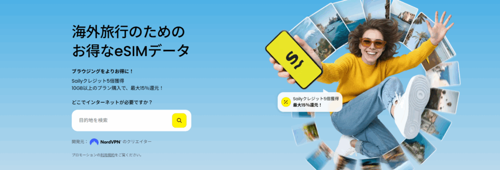 Sailyは、NordVPNを手掛けるチームにより提供されているeSIMサービスです。200以上の国・地域に対応しており、渡航前にプランを購入・インストールしておくことで、目的地到着後すぐに通信を開始できる手軽さが特徴です。