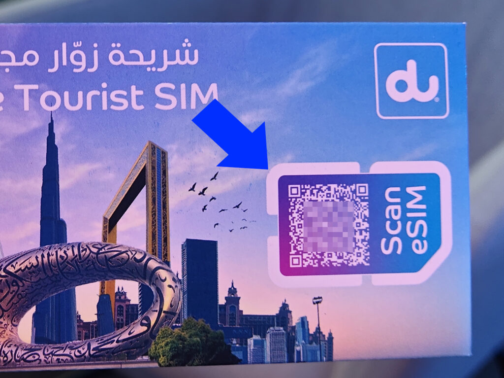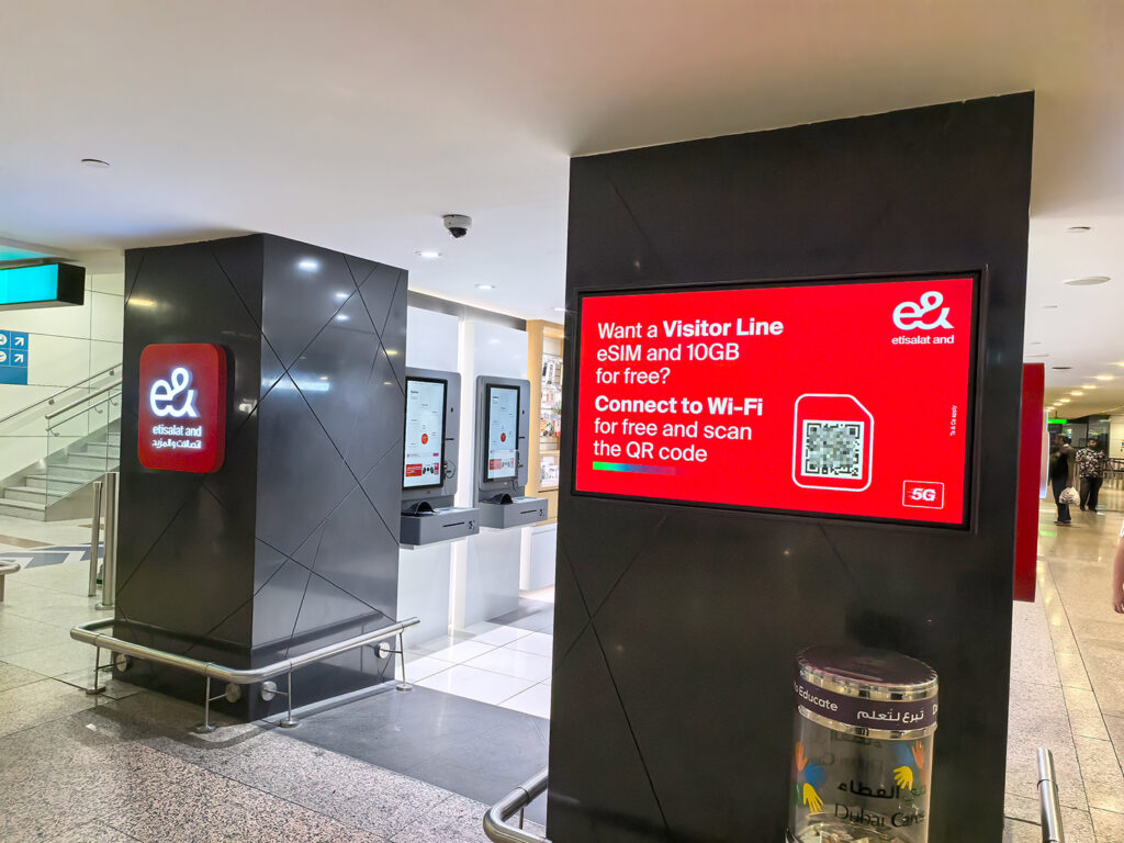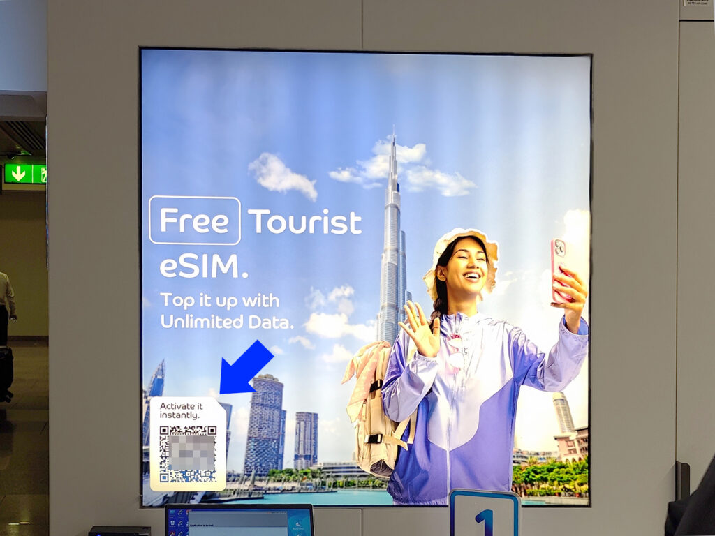 ただしドバイの入港カウンターは現在、日本人を含む多くの外国人は自動化ゲートを通るのでこのSIMカードをもらうことができません。しかしそれを気にすることは無いのです。入国後に荷物を受け取り到着ロビーに出てくると、UAE No.1キャリアのe&(Etisalat)が無料で利用できるeSIMの提供を行っています。このeSIMはe&の店舗前に大々的にQRコードが掲げられており、誰でも自由に入手できるのです。
