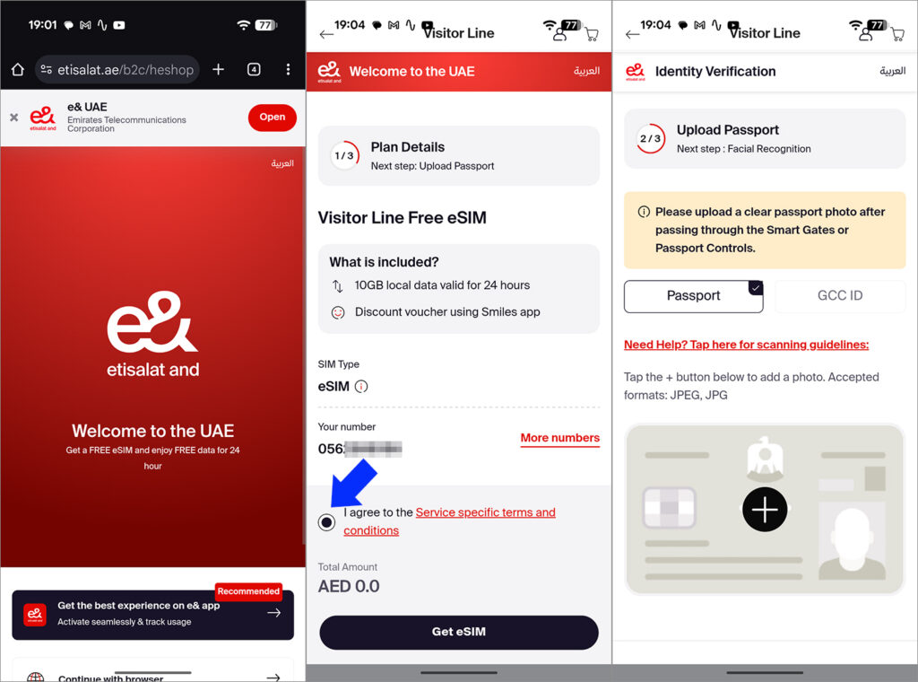 実はこのeSIMはオンラインでも申請できます。ただしスマートフォンのGPSでUAE国内にいないと開通までできない仕様になっていました。オンラインで直接入手する場合もドバイ空港到着後に作業を行うことになるでしょう。