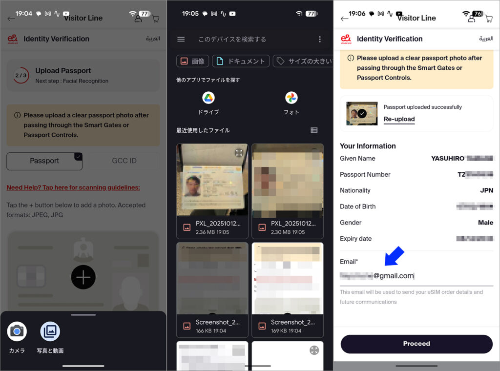 パスポート読み取り画面のパスポートのイラスト部分の「+」をタップすると、次の画面でカメラか写真からパスポートをアップロードします。カメラにしてその場でパスポートを撮影してもいいのですが、照明がうまくあたらず影ができてしまうことがあったり、人の多い空港内でパスポートを出すのはやや危険なのであらかじめスマートフォンでパスポートの写真を撮影しておき、それをアップロードしたほうがいいと思います。そしてパスポートをアップロードするとその内容が画面に表示されるので、下にメールアドレスを入力し、一番下の「Proceed」をタップします。