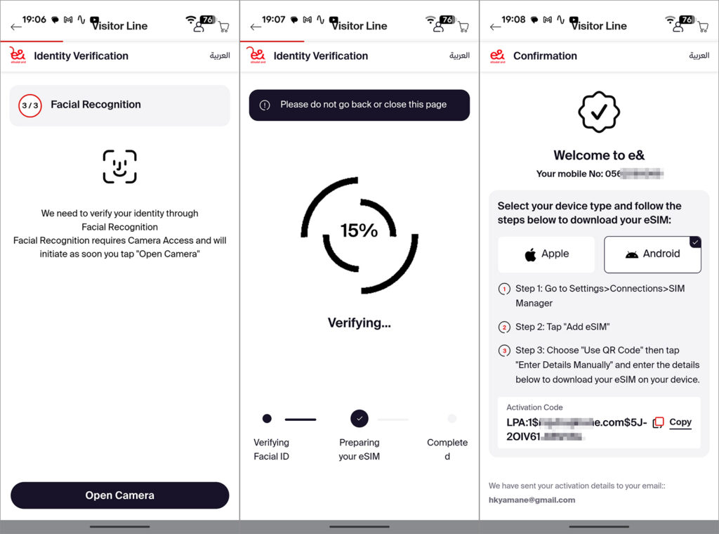 次の画面では顔認証を行います。画面一番下の「Open Camera」をタップして進みますが、後ろに人が通るとエラーになってしまいます。そのため壁際を探してそこで顔の認証を行うとよいと思います。画面の指示に顔を動かしたあとは、最終的な認証が行われ、1分程度で無事にeSIMの登録が終わります。あとは「Apple」「Android」好きな方をタップして、eSIMのインストールに進めます。