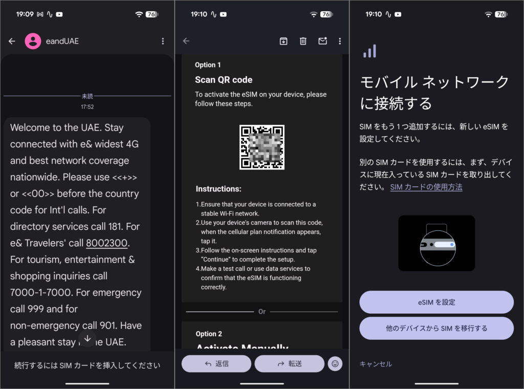 なお開通後はSMSで通知が届きます。またメールでもeSIMのQRコードが届くので、そちらからもインストール可能です。あとはiPhone、Android、それぞれ通常のeSIM導入手順でインストールすればOKです。この時点から24時間有効となるので、たとえば空港からホテルまでタクシーで移動するなど、途中でデータ通信環境が不要な場合は、ホテルに着いてから開通するなどして、24時間の有効期限を友好的に利用するのがいいかもしれません。