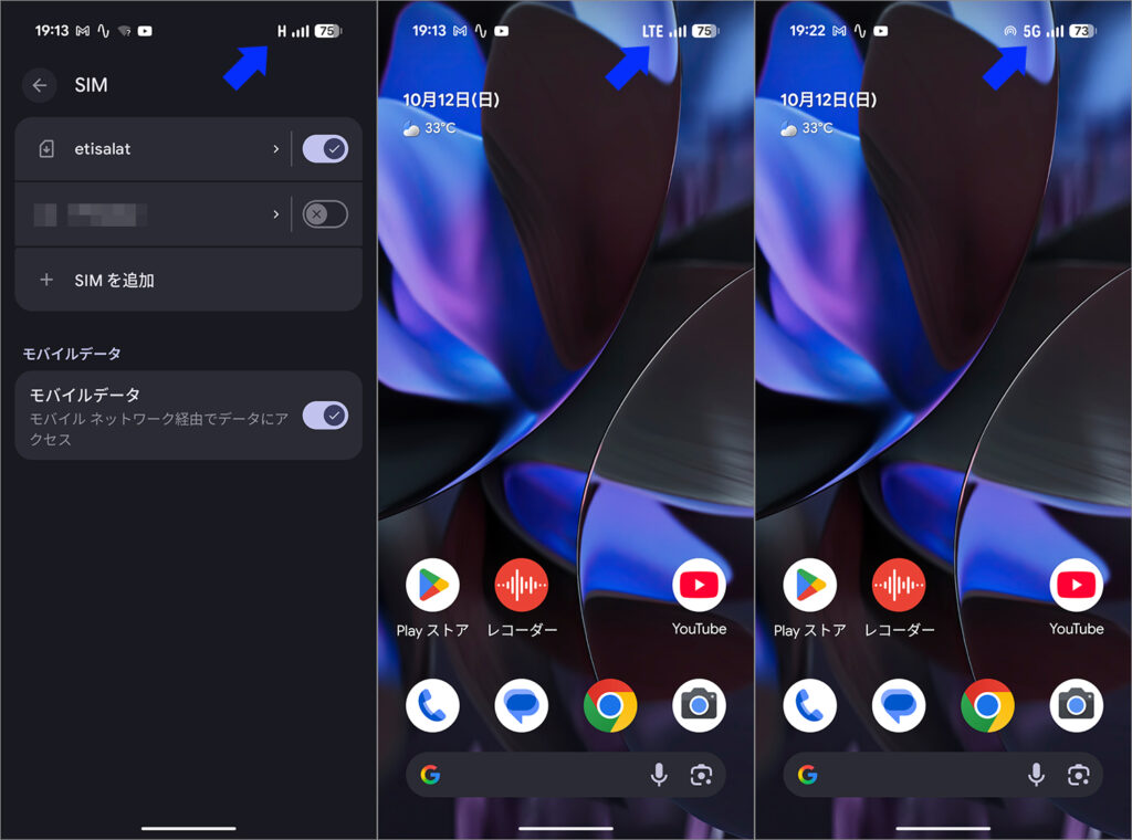 インストール完了後はWi-FiをOFFにすればアンテナピクトが立っているはずです。最初は「H」(HSPA、3G)だったので一度オフラインにして再度オンラインにすると「LTE」に。無料だしLTE接続かと思いきや、そのまますぐに「5G」に切り替わりました。