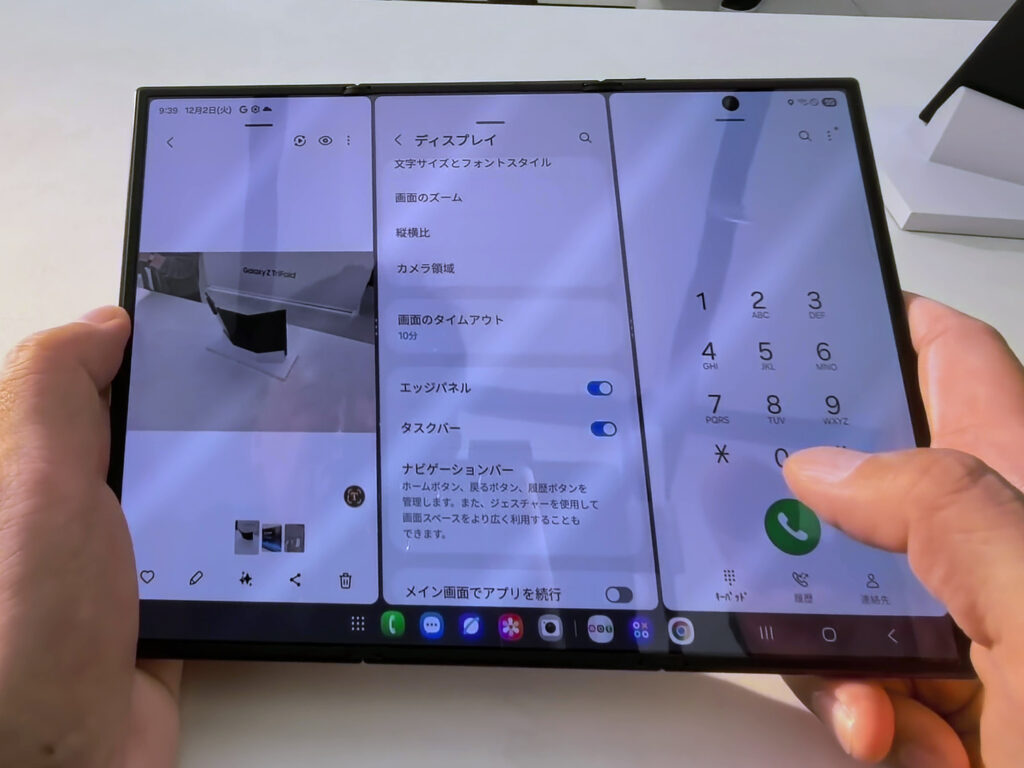 一般的なスマートフォンはどのモデルもディスプレイが縦に長い形状をしていますが、現在発売されている折りたたみスマートフォンは正方形のディスプレイを半分に折りたたむことが可能で、開けば正方形のタブレット、閉じれば普通のスマートフォンとして使えます。ところがサムスンのGalaxy Z TriFoldは4:3の比率の長方形のディスプレイを搭載し、タブレットとして使えると同時に、左右から折りたたむと普通のスマートフォンに変形するのです。