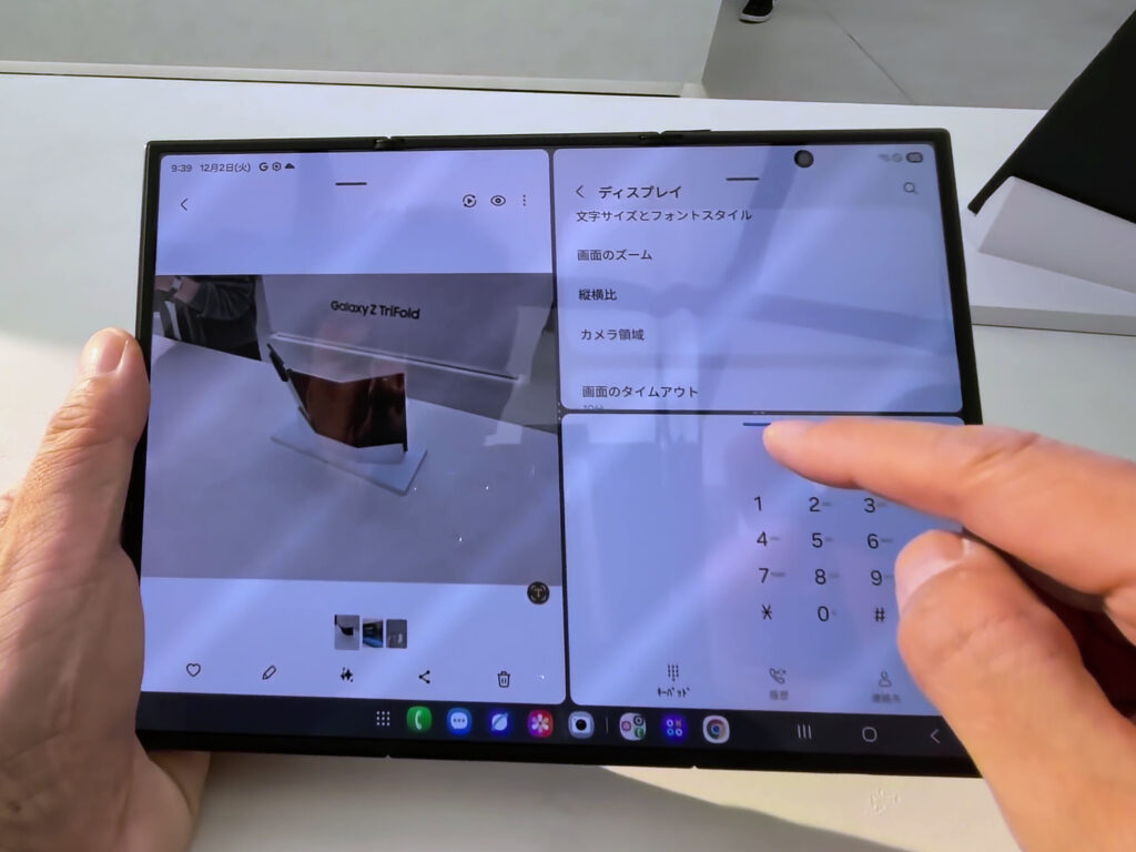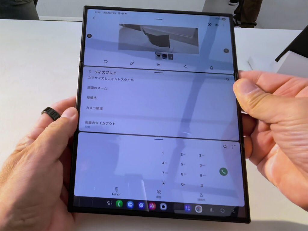 アプリの配置は3列だけではなく、2つを上下にも並べられます。左側で検索、右側の上で動画を見ながら、その下でSNSを表示、といったことも無理なくできるわけです。この画面配置はサムスンの二つ折りのスマートフォンでもできましたが、3つのウィンドウを使うには画面が狭すぎます。三つ折りスマートフォンだからこそこのような表示が実用的なのです。