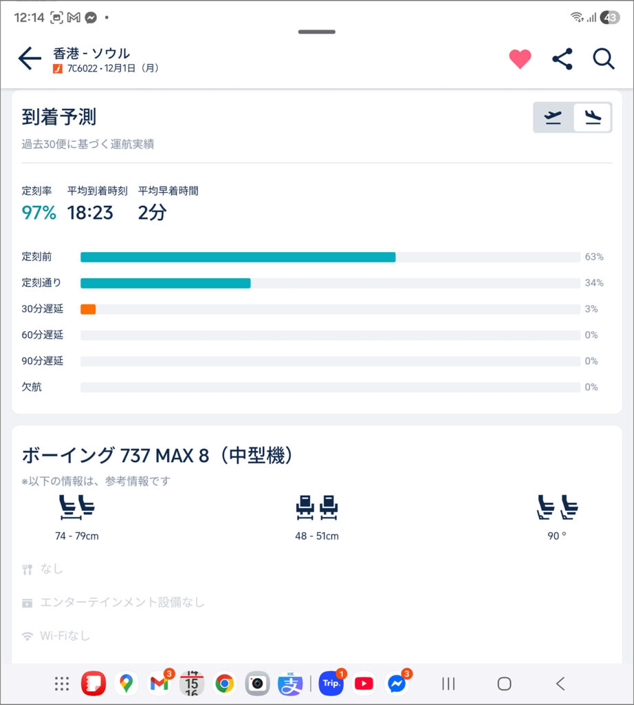 3.過去の遅延情報:過去30日のフライトの遅延状況を見ることができます。目的地に到着してからスケジュールがタイトな時、乗り継ぎがギリギリの時など、これから乗るフライトがどの程度定刻通りに飛んでいるかがわかるわけです。