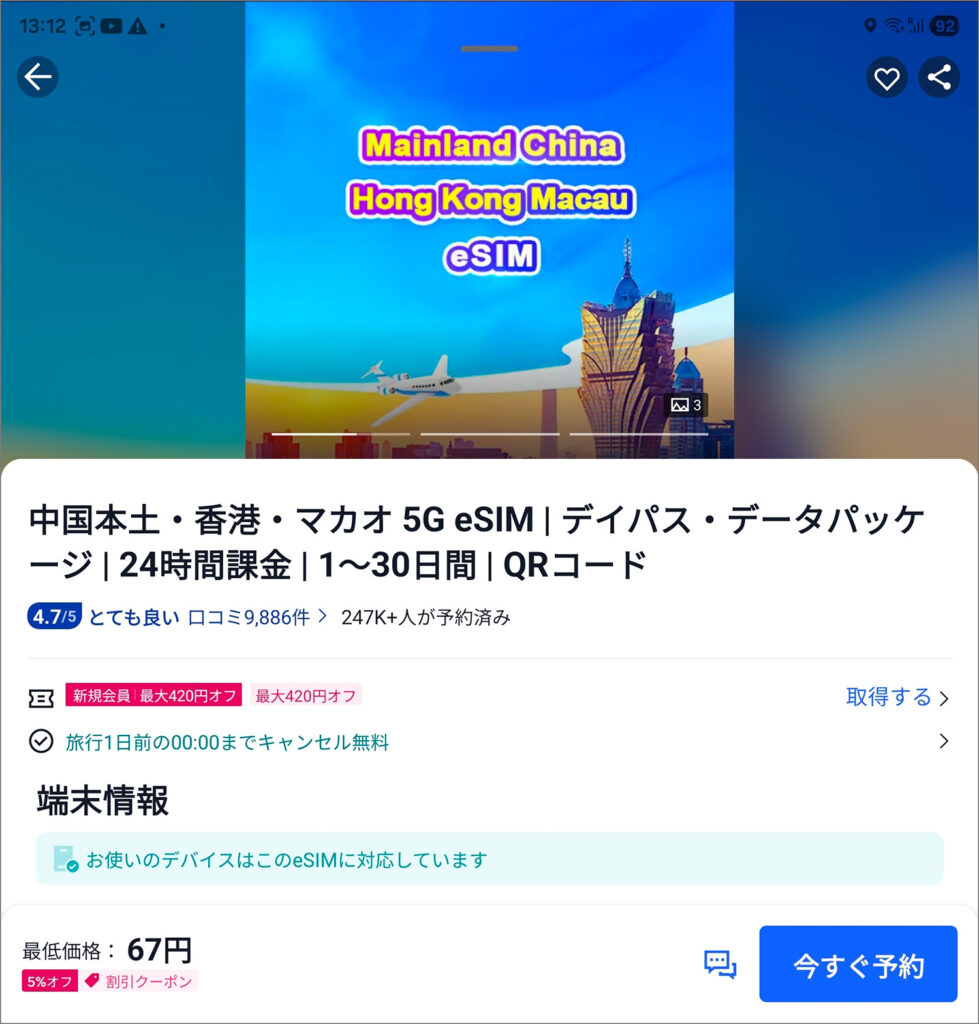 今回は航空券やホテルの予約サイトであるTrip.comの販売するeSIMを購入。中国で使ってみました。細かい日数ごとに購入でき、Trip.comに個人情報を登録しておけば1分足らずでeSIMを購入できます。