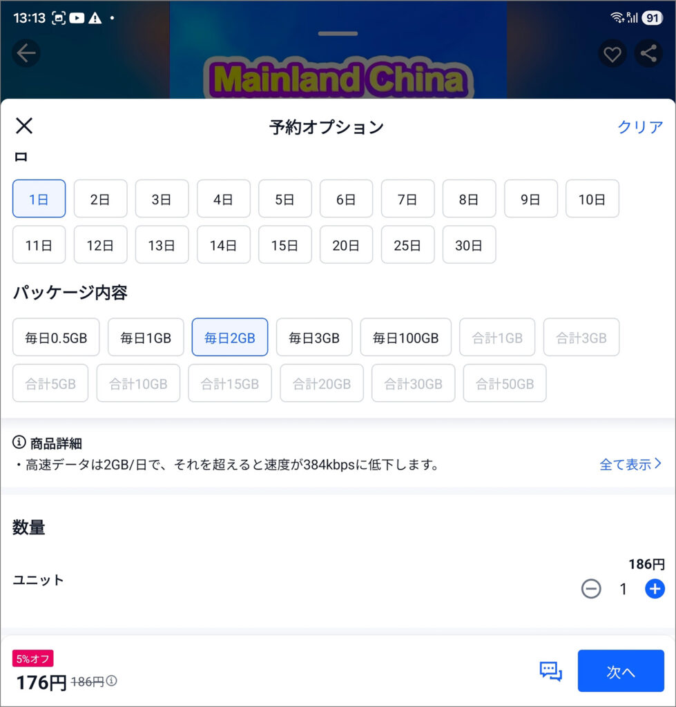 プラン画面を見ると、1日から15日までは1日単位。また毎日の容量、合計容量からも選べます。そのため「連日仕事でデータ通信をする機会が少ない場合は3日で合計3GB」、「展示会で日中の連絡を毎日するので毎日1GBを5日間」のように、利用シーンに応じて選べます。今回は1日2GBを購入。176円でした。