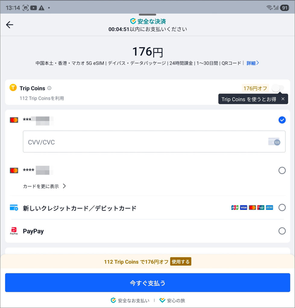 筆者はすでにTrip.comを使っているため、アプリ内に支払い情報が保存されています。あとは支払い画面でクレジットカードを選べば購入完了です。