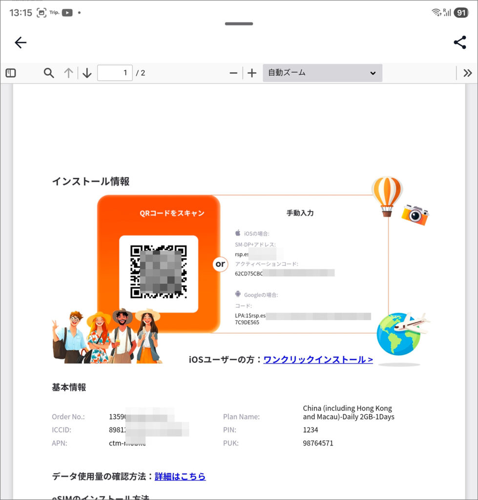 アプリ内、メールにeSIMのQRコードが表示されるので、あとはインストールするだけです。