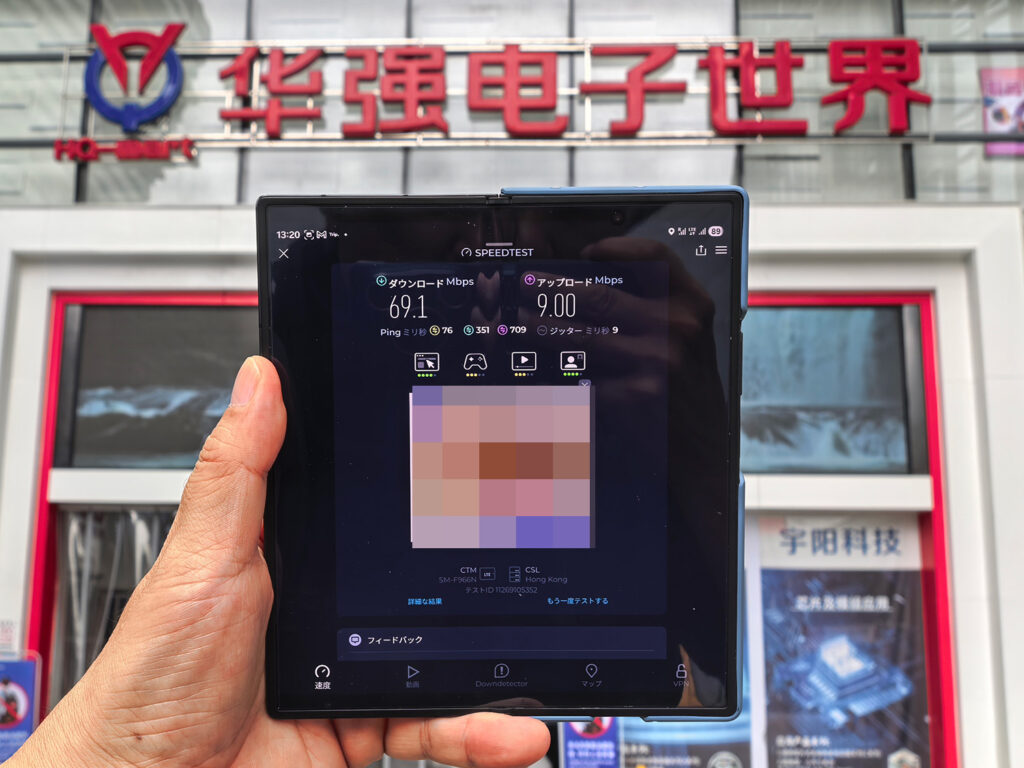 今回は中国・深センの電脳街を訪問。徒歩10分圏内を行ったり来たりしました。下りは40-80Mpbs、上りは10Mbps程度。上りがやや不満ではありますが、実用性は問題ありません。なお過去記事での上海での利用では下りも50Mbps以上とかなり高速。深セン電脳街は人が多いことで接続状況が悪いのかもしれません。